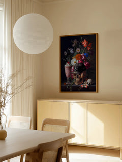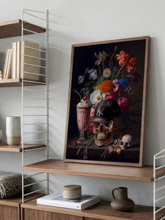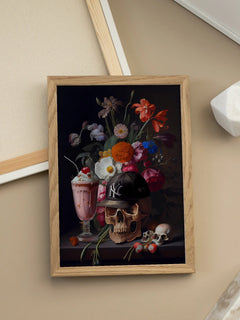 Ein faszinierendes Stillleben, das einen Totenkopf mit einer schwarzen Baseballkappe vor einem üppigen Blumenstrauß zeigt. Neben dem Totenkopf steht ein verlockender rosa Milchshake mit Sahne und einer Kirsche. Die Komposition verbindet Elemente der Vergänglichkeit und des modernen Lebensstils auf eindrucksvolle Weise und schafft eine einzigartige und provokative Darstellung.