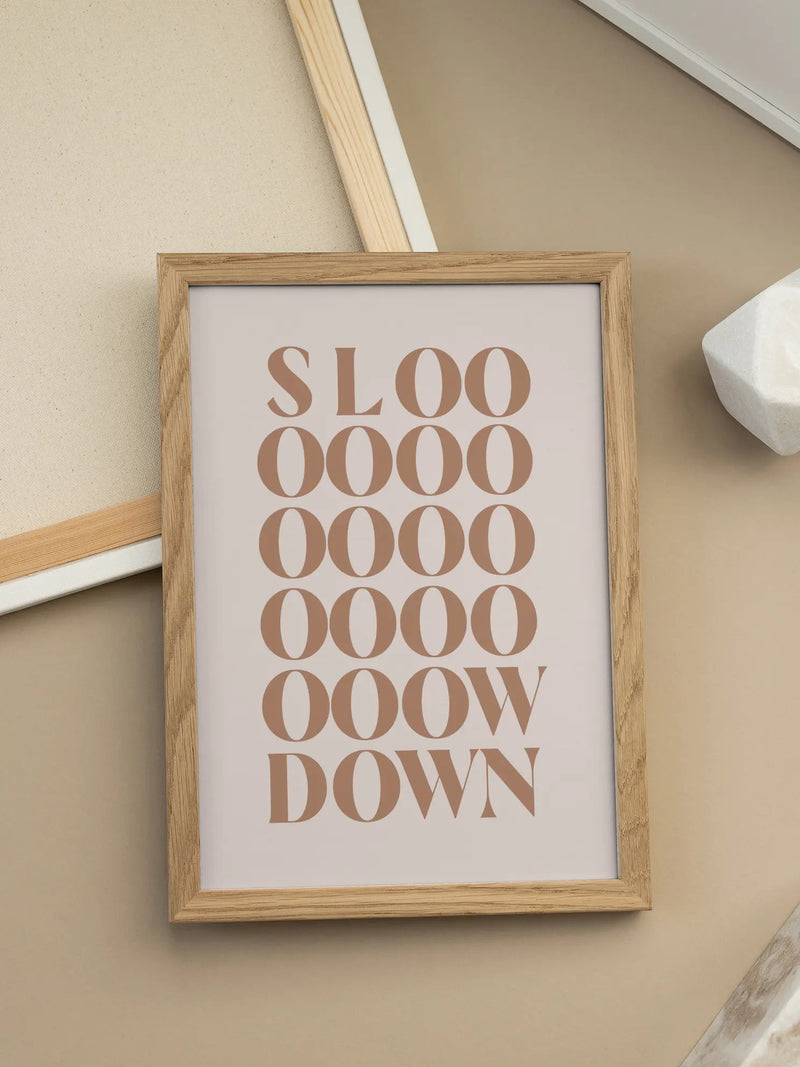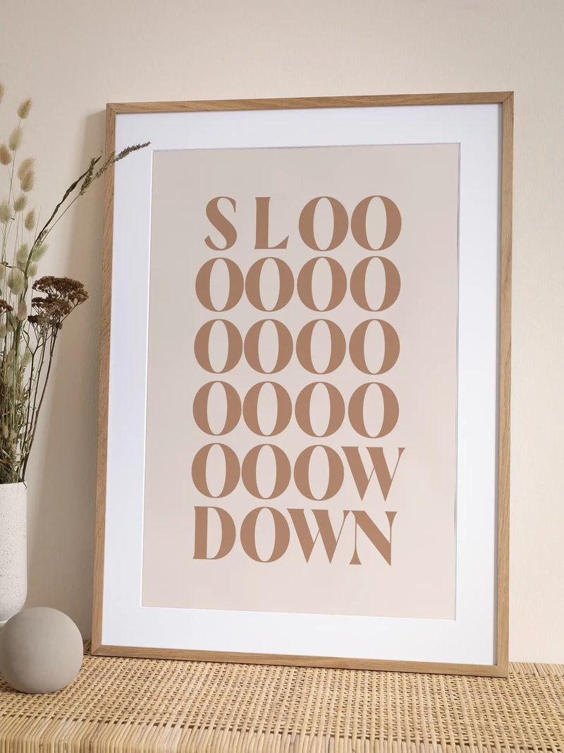 Dieses Poster mit dem Text "Slow down" in hellbrauner Farbe auf beigem Hintergrund ist perfekt für alle, die ein wenig Ruhe in ihr Zuhause bringen möchten. Typografie-Poster sind großartig, um eine persönliche Note in deine Bilderwand zu bringen.