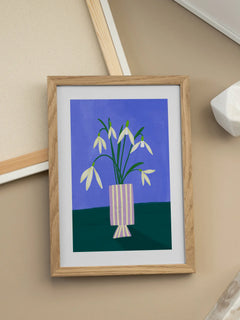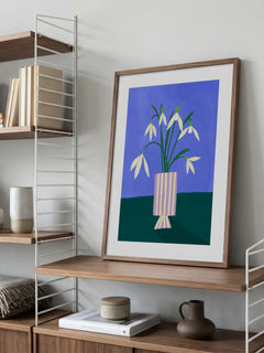 Dieses moderne Poster zeigt eine Illustration von weißen Schneeglöckchen, die in einer gestreiften Vase arrangiert sind. Der Hintergrund ist in einem lebhaften Blau gehalten, was den fröhlichen und erfrischenden Charakter des Bildes unterstreicht. Die Kombination aus den zarten Blumen und den kräftigen Farben macht dieses Kunstwerk zu einem perfekten Hingucker für jeden Raum.