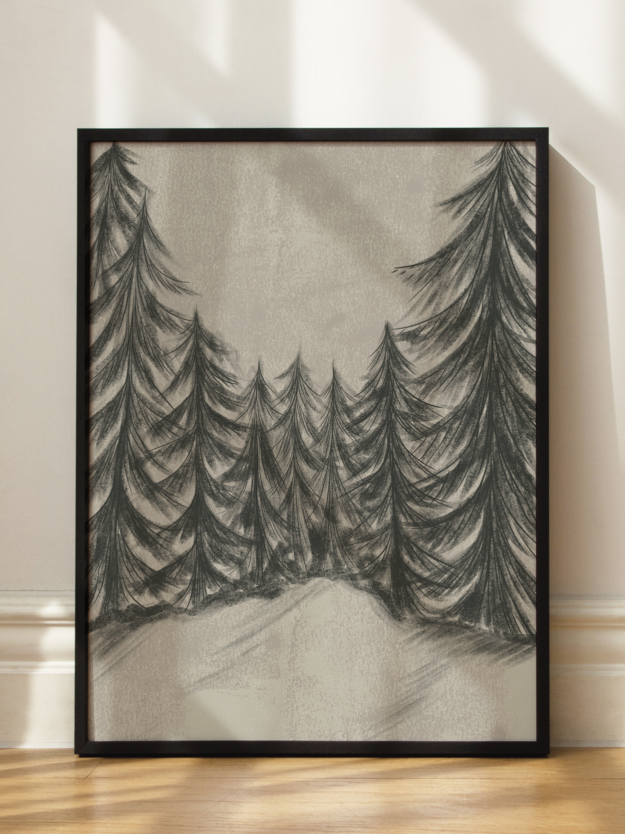 Dieses Poster zeigt eine verschneite Landschaft mit einem dichten Wald aus Tannenbäumen. Die Illustration hat einen Vintage-Look, der durch die Verwendung von gedämpften Farben und einer skizzenhaften Darstellung der Bäume erreicht wird. Die ruhige und friedliche Atmosphäre des Bildes lädt zum Träumen ein und bringt die Schönheit der Natur in Ihr Zuhause.