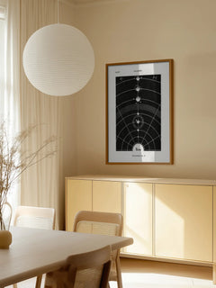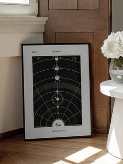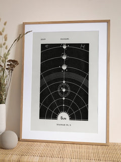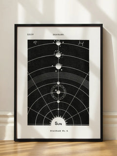 Diese schwarz-weiße Illustration zeigt ein stilisiertes Sonnensystem mit dem Text "Sun" darunter. Die geometrischen Linien und Kreise verleihen dem Bild einen klassischen und zugleich modernen Touch. Perfekt für ein Zuhause, das einen Hauch von Wissenschaft und Kunst vereinen möchte.