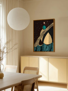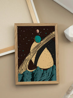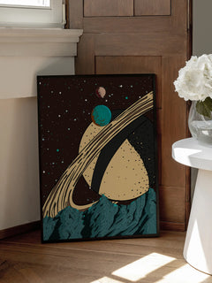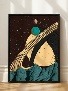 Dieses Poster zeigt eine grafische Illustration von Planeten im Weltraum, die über einer Berglandschaft schweben. Im Hintergrund ist ein großer Planet mit markanten Ringen zu sehen. Die farbenfrohe und verspielte Darstellung eignet sich perfekt für das Zuhause eines kreativen Geistes und verleiht jedem Raum eine fantasievolle Note.