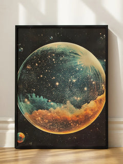 Dieses faszinierende Poster zeigt eine große Blase im Weltraum, die mit funkelnden Sternen und farbenfrohen Wolken gefüllt ist. Der dunkle Hintergrund ist mit kleinen Blasen übersät, was dem Bild eine mystische und verträumte Atmosphäre verleiht. Die lebendigen und kontrastreichen Farben schaffen ein beeindruckendes visuelles Erlebnis, das die Schönheit und das Geheimnis des Universums einfängt.