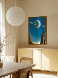 Ein faszinierendes Poster, das einen Planeten mit Ringen vor einem tiefblauen Himmel zeigt. Im Vordergrund sind markante orangefarbene Felsen zu sehen, die eine dramatische Landschaft schaffen. Der Retro-Look des Bildes wird durch Kratzer und Flecken verstärkt, die dem Kunstwerk einen nostalgischen Charme verleihen. Perfekt für Liebhaber von Weltraumkunst und Vintage-Designs.