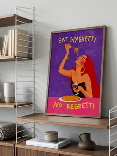 Humorvolle Illustration einer Frau beim genüsslichen Spaghetti-Essen mit dem Spruch 'Eat Spaghetti No Regretti'. Funktioniert besonders gut in der Küche oder als Akzent im Esszimmer. Die knalligen Farben setzen einen verspielten Fokus in moderne Räume.
