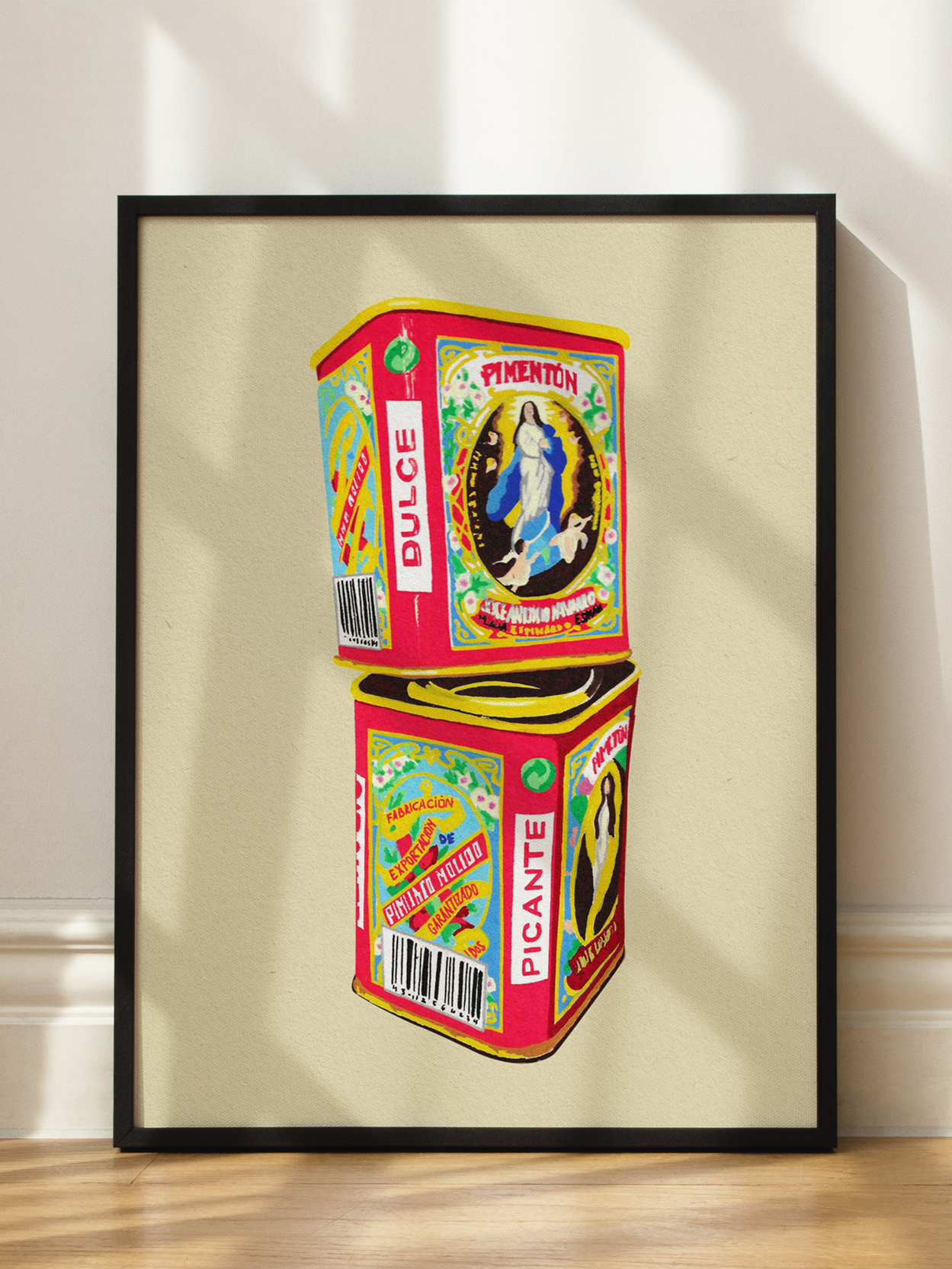 Dieses Poster zeigt eine lebendige Illustration von zwei roten Paprikadosen auf einem beigen Hintergrund. Die Dosen sind kunstvoll gestaltet und tragen die Aufschriften "Dulce" und "Picante", was auf die unterschiedlichen Geschmacksrichtungen hinweist. Die farbenfrohe Darstellung bringt einen Hauch von spanischer Küche und Kultur in dein Zuhause und ist perfekt geeignet, um deiner Küche Farbe und Leben zu verleihen.