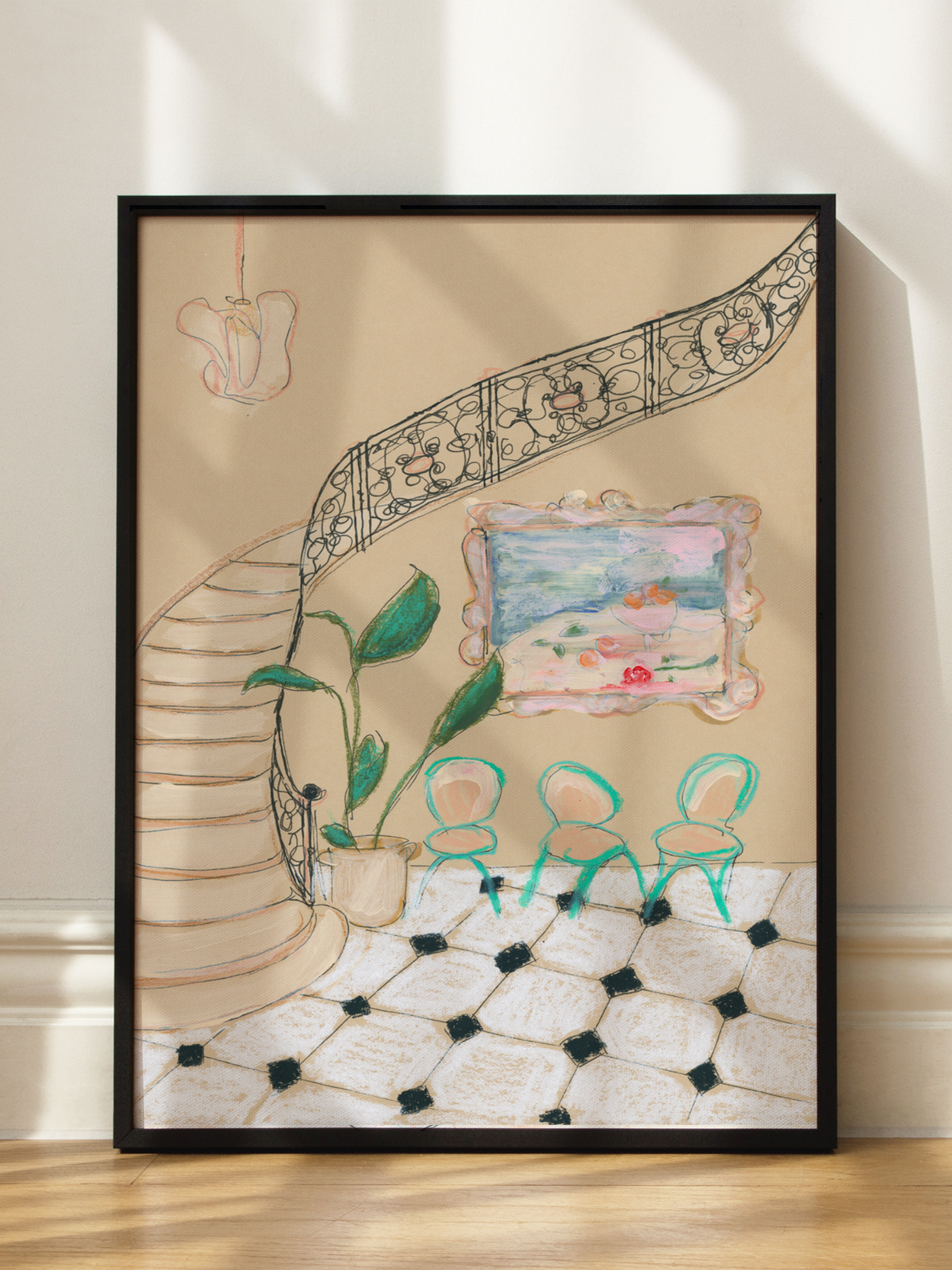 Dieses handgemalte Poster zeigt eine elegante Treppenszene mit einem kunstvollen Geländer, einem schwarz-weißen Fliesenboden und einer grünen Pflanze. An der Wand hängt ein Gemälde, das eine zusätzliche künstlerische Dimension hinzufügt. Die Komposition strahlt eine ruhige und stilvolle Atmosphäre aus, ideal für alle, die ihrem Zuhause eine künstlerische Note verleihen möchten.