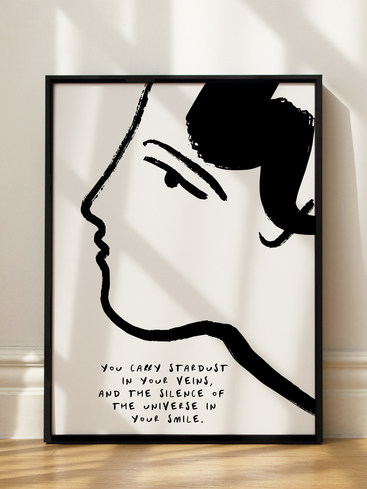 Diese Schwarz-Weiß-Illustration zeigt ein Gesicht in Seitenansicht, begleitet von einem inspirierenden Zitat: "You carry stardust in your veins, and the silence of the universe in your smile." Dieses Poster bringt eine poetische und nachdenkliche Atmosphäre in dein Zuhause und ist perfekt für alle, die Kunst und Weisheit schätzen.