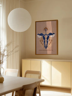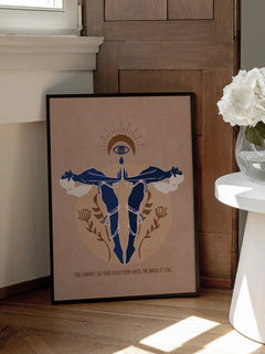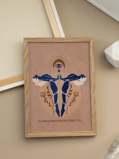 Dieses eindrucksvolle Poster zeigt zwei Frauen, die sich in einem ruhigen blauen Wasser spiegeln. Über ihnen schwebt ein Auge, das symbolisch auf sie herabblickt. Der Text „You cannot see your reflection until the water is still“ unterstreicht die Botschaft der Selbstreflexion und inneren Ruhe. Der warme braune Hintergrund verleiht dem Bild eine beruhigende und harmonische Atmosphäre.
