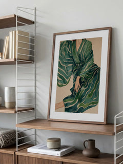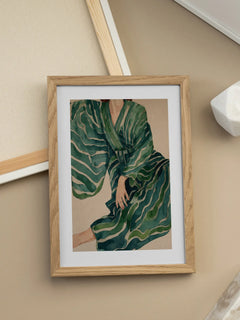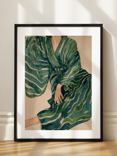 Dieses Poster zeigt eine Frau in einem gestreiften Kimono in den Farben Grün und Blau. Die Illustration fängt die Eleganz und Anmut der traditionellen Kleidung ein und kombiniert sie mit modernen künstlerischen Elementen. Die weichen, fließenden Linien des Kimonos verleihen dem Bild eine ruhige und harmonische Ausstrahlung. Perfekt für Kunstliebhaber, die ihrem Raum einen Hauch von Kultur und Stil verleihen möchten.