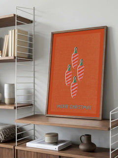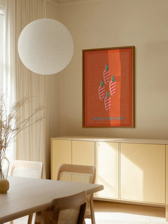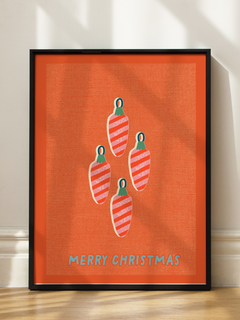 Ein festliches Poster, das rot gestreifte Weihnachtsornamente auf einem rot strukturierten Hintergrund zeigt, mit dem Text "Merry Christmas" in Blau. Dieses Poster ist perfekt, um Weihnachtsstimmung in dein Zuhause zu bringen.