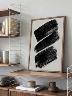 Dieses minimalistische Poster zeigt zwei große schwarze Pinselstriche auf einem weißen Hintergrund. Die kraftvollen und dynamischen Linien verleihen jedem Raum eine moderne und stilvolle Atmosphäre. Perfekt für Liebhaber von schlichter und eleganter Kunst, die einen Hauch von Raffinesse in ihr Zuhause bringen möchten.