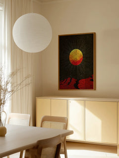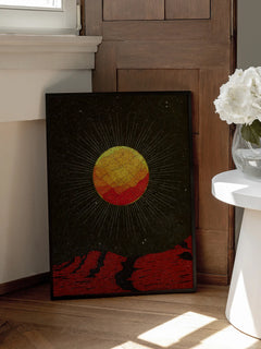 Dieses Poster zeigt eine grafische Illustration einer gelben und roten Sonne, die mit strahlenden Linien über einer roten Landschaft auf einem schwarzen Hintergrund leuchtet. Die kräftigen Farben und der Kontrast zwischen der Sonne und dem dunklen Hintergrund schaffen eine dramatische und faszinierende Atmosphäre. Ideal für Schlafzimmer, um eine warme und einladende Stimmung zu erzeugen.