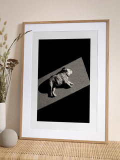 Ein bezauberndes Foto eines Hundes, der friedlich auf einem Teppich in einem Sonnenstrahl schläft. Der Kontrast zwischen dem hellen Licht und dem dunklen Hintergrund hebt die entspannte Haltung des Hundes hervor. Dieses Bild ist ideal für Hundeliebhaber und bringt eine warme, gemütliche Atmosphäre in jeden Raum.