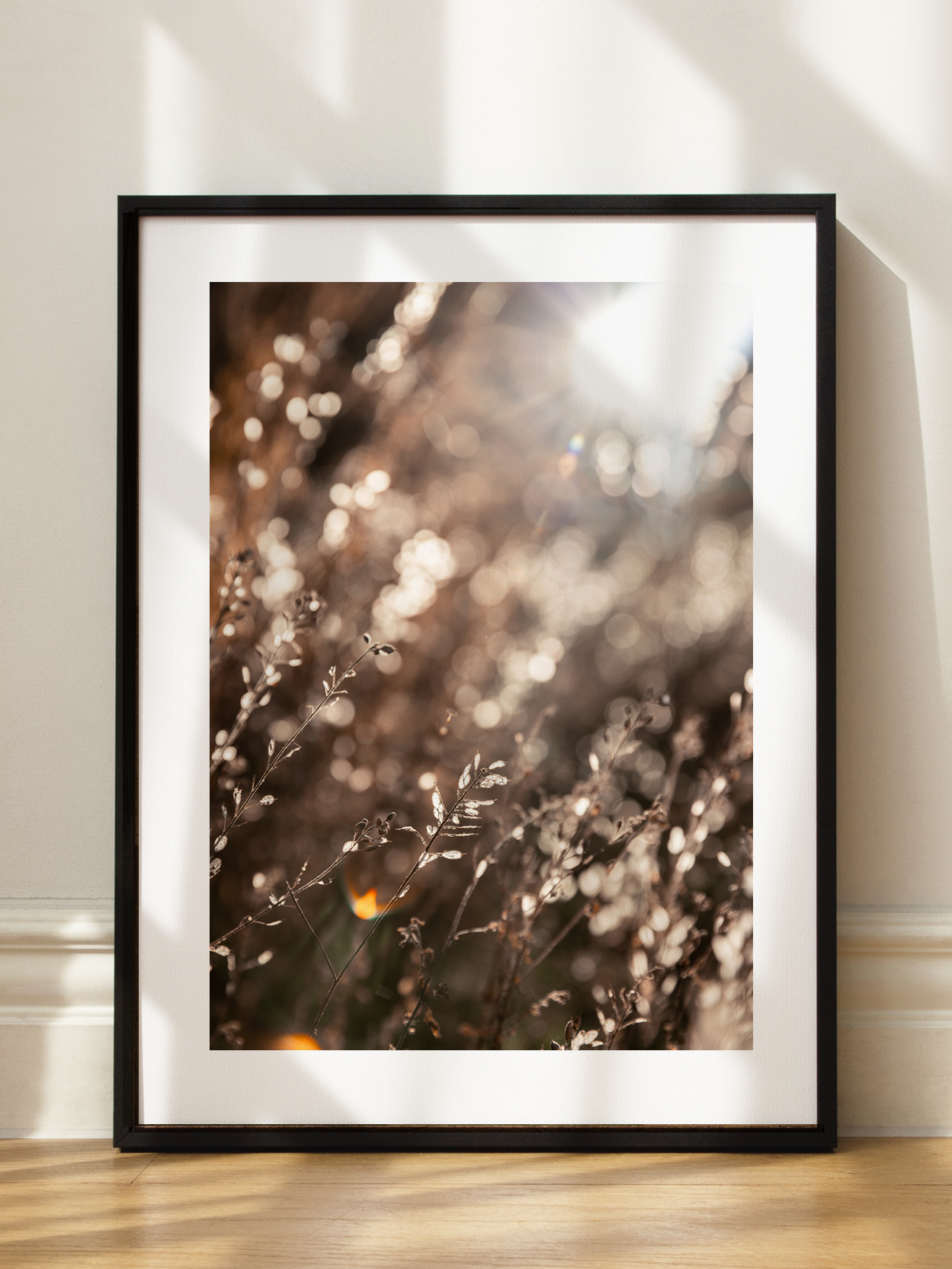 Dieses Poster zeigt eine stimmungsvolle Fotografie von getrocknetem Gras, das im warmen Sonnenlicht erstrahlt. Die Lichtreflexe und die sanften Brauntöne schaffen eine beruhigende und natürliche Atmosphäre. Perfekt geeignet, um in einem Wohnzimmer oder Schlafzimmer eine entspannende und erdige Note zu setzen.