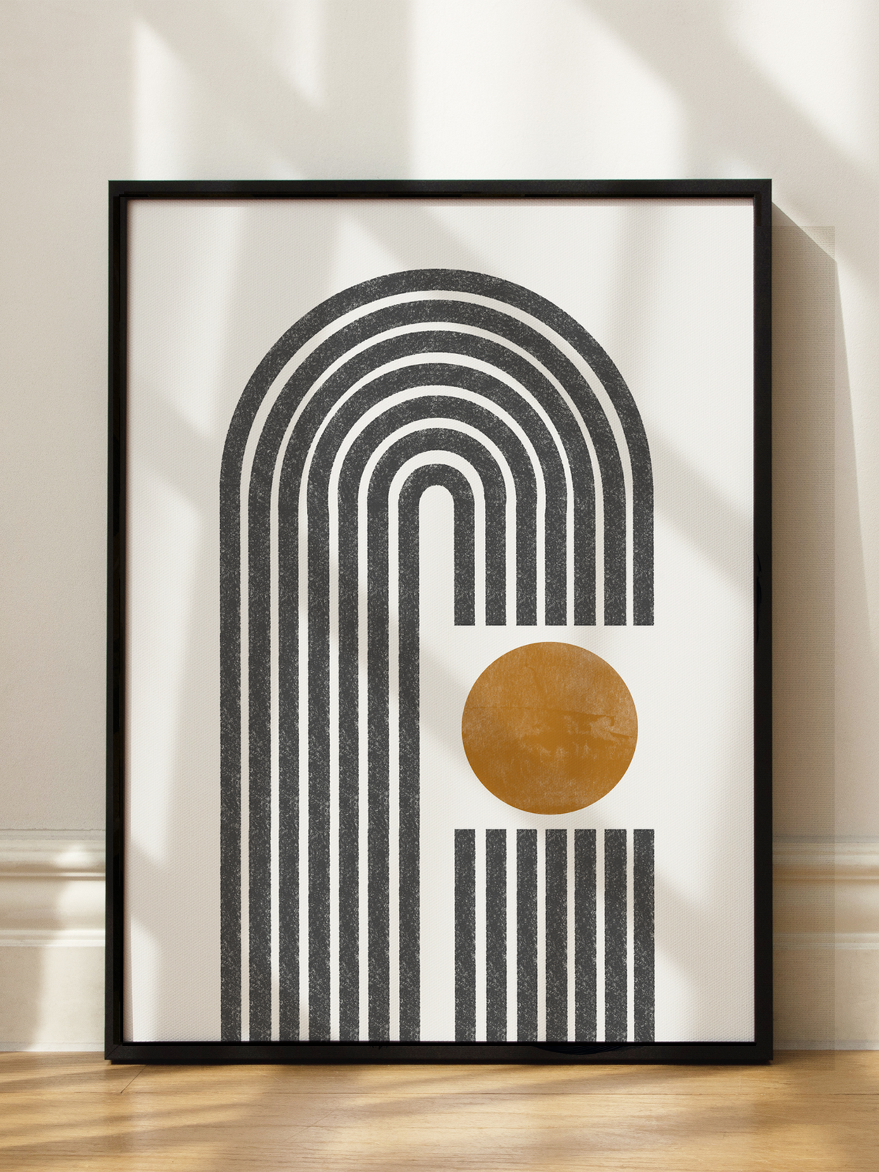 Diese grafische Illustration zeigt schwarze Linien, die einen eleganten Bogen formen, begleitet von einem orangefarbenen Kreis auf einem grauen Hintergrund. Das minimalistische Design verleiht jedem Raum einen modernen und stilvollen Look und eignet sich perfekt für zeitgenössische Wohnräume.