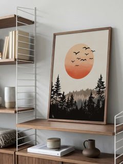 Diese grafische Illustration zeigt Vögel, die vor einer großen, orangefarbenen Sonne über einen dichten Wald fliegen. Die Silhouetten der Bäume und Vögel heben sich kontrastreich vom hellen Hintergrund ab und schaffen eine ruhige und zugleich dynamische Atmosphäre. Dieses Poster bringt einen modernen und natürlichen Look in dein Zuhause und eignet sich perfekt, um eine Verbindung zur Natur herzustellen.