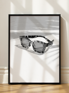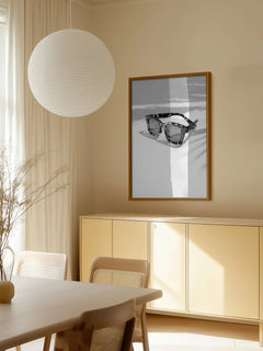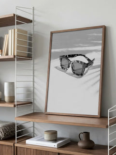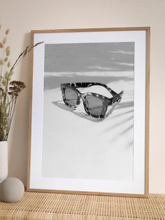Diese stilvolle Schwarz-Weiß-Fotografie zeigt eine Sonnenbrille mit Wassertröpfchen, die auf einem sonnigen Boden liegt. Die Schatten von Palmenblättern verleihen dem Bild eine tropische Atmosphäre und machen es zu einer perfekten Ergänzung für ein modernes, trendiges Zuhause. Die Komposition strahlt eine entspannte, sommerliche Stimmung aus und eignet sich hervorragend, um jedem Raum einen Hauch von Eleganz und Stil zu verleihen.