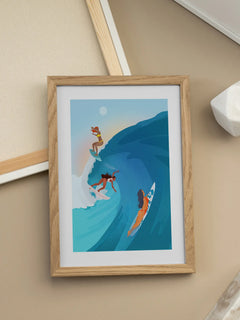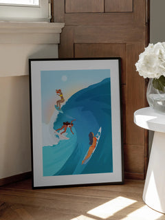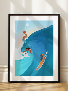 Das Poster zeigt drei Surferinnen, die eine beeindruckende Welle in einem lebendigen, farbenfrohen Ozean reiten. Die Szene ist in leuchtenden Blau- und Orangetönen gehalten, die ein Gefühl von Abenteuer und Freiheit vermitteln. Die dynamische Komposition und die kräftigen Farben fangen die Energie und den Spaß des Surfens perfekt ein.