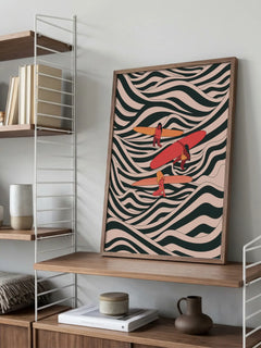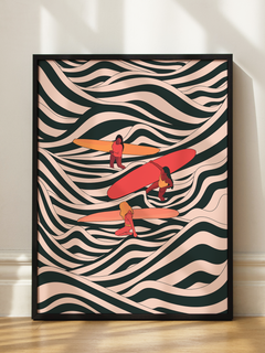 Dieses lebendige Poster zeigt eine Illustration von drei Frauen, die auf einem gestreiften Meer surfen. Die dynamischen Wellen und die farbenfrohen Surfbretter verleihen dem Bild eine energiegeladene und fröhliche Atmosphäre. Perfekt für ein Zuhause, das einen Hauch von Abenteuer und Lebendigkeit sucht.