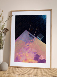Dieses kreative Poster zeigt eine faszinierende Fotografie eines Pools mit einer wunderschönen rosa Wolkenreflexion auf der Wasseroberfläche. Neben dem Pool liegt ein Handtuch, das die Szene ergänzt. Die trendigen Farben und die surreale Atmosphäre machen dieses Bild zu einem einzigartigen Kunstwerk, das jedem Raum einen modernen und stilvollen Touch verleiht.