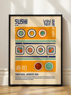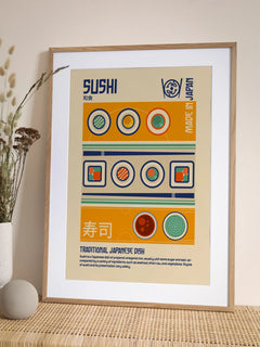 Diese grafische Illustration zeigt verschiedene Sushi-Elemente in einem stilisierten Design, begleitet von Texten, die die japanische Küche beschreiben. Die Farben sind lebendig und kontrastreich, was dem Bild einen modernen und ansprechenden Look verleiht. Perfekt für die Küche, bringt dieses Poster einen Hauch von japanischer Kultur und kulinarischer Kunst in dein Zuhause.