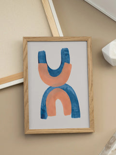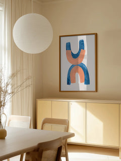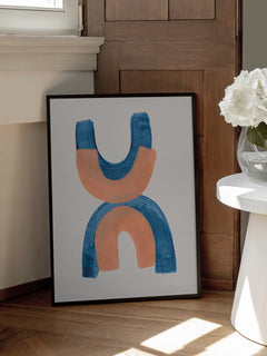 Dieses moderne Poster zeigt abstrakte Bögen in Blau und Orange auf einem hellen Hintergrund. Die trendigen Farben und die minimalistische Gestaltung machen es zu einem perfekten Kunstwerk für zeitgenössische Innenräume. Die harmonische Kombination der Farben verleiht dem Bild eine beruhigende und zugleich dynamische Ausstrahlung.