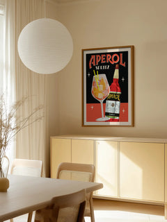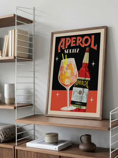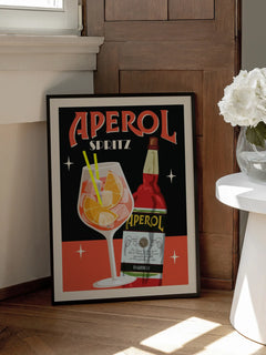Dieses Retro-Poster zeigt einen Aperol Spritz mit einer Flasche und einem Glas voller Orangen. Der schwarze Hintergrund mit roten Details verleiht dem Poster einen nostalgischen Retro-Look. Perfekt für die Küche, um einen Hauch von Vintage-Charme und Eleganz hinzuzufügen.