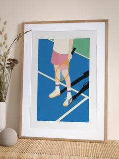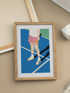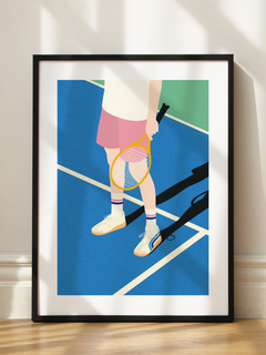 Dieses Poster zeigt eine stilisierte Darstellung einer Person auf einem Tennisplatz. Die Person trägt weiße Socken und Turnschuhe und hält einen Tennisschläger in der Hand. Der Tennisplatz ist in lebendigen Blau- und Grüntönen gehalten, was dem Bild eine frische und sportliche Atmosphäre verleiht. Die minimalistische Darstellung und die klaren Linien machen dieses Kunstwerk zu einem modernen Highlight für Sportliebhaber.