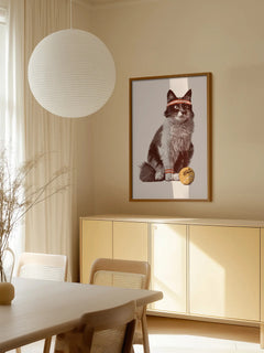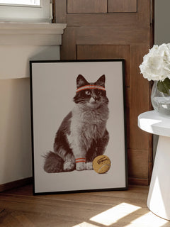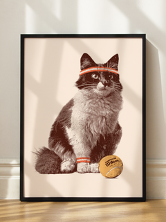 Dieses humorvolle Poster zeigt eine Katze mit einem roten Stirnband und einem Tennisball. Die Katze sitzt aufmerksam und scheint bereit für ein Tennismatch zu sein. Der Tennisball liegt direkt neben ihr, was die sportliche Thematik unterstreicht. Dieses Bild bringt mit Sicherheit ein Lächeln auf das Gesicht des Betrachters und ist perfekt für alle Katzen- und Tennisliebhaber.