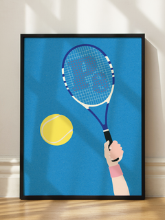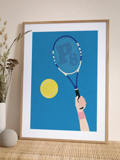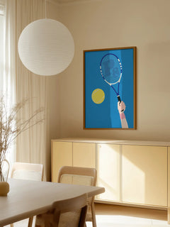 Dieses lebendige Poster zeigt eine Illustration eines Tennisschlägers und eines Tennisballs vor einem klaren blauen Hintergrund. Die kräftigen Farben und das sportliche Thema machen es zu einer idealen Wahl für Sportliebhaber und Tennisfans. Perfekt, um Energie und Dynamik in jeden Raum zu bringen.