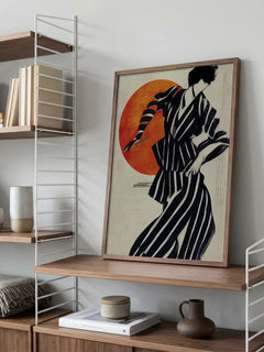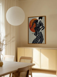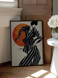 Dieses Poster zeigt eine dynamische Darstellung einer Frau in einem schwarz-weiß gestreiften Kleid, die vor einem leuchtend orangefarbenen Kreis posiert. Der beige Hintergrund verleiht dem Bild eine warme und einladende Atmosphäre. Die Kombination aus den kräftigen Streifen und dem intensiven Orange schafft einen auffälligen Kontrast, der die Aufmerksamkeit auf die elegante Bewegung der Figur lenkt. Ein Kunstwerk, das sowohl modern als auch klassisch wirkt und jedem Raum einen Hauch von Stil verleiht.