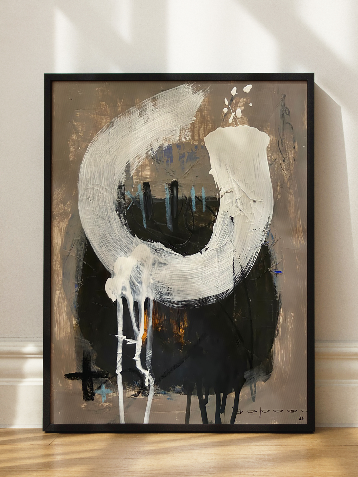 Tauche ein in die Welt der abstrakten Kunst mit diesem Poster, das dicke weiße Pinselstriche auf einem Hintergrund aus Schwarz, Braun und Blau zeigt. Es ist eine kraftvolle Darstellung von Kreativität und Ausdruckskraft, perfekt für Kunstliebhaber oder jeden, der einen Hauch von Fantasie in seinen Raum bringen möchte.