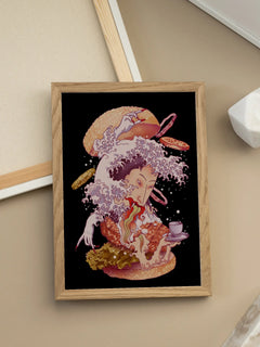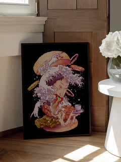 Dieses Poster zeigt eine humorvolle Illustration, die einen Burger mit der berühmten Welle aus Hokusais Gemälde "Die große Welle vor Kanagawa" kombiniert. Die kreative Verschmelzung von klassischer Kunst und moderner Popkultur macht dieses Kunstwerk zu einem einzigartigen Blickfang. Perfekt für Kunstliebhaber mit einem Sinn für Humor und einer Vorliebe für außergewöhnliche Designs.