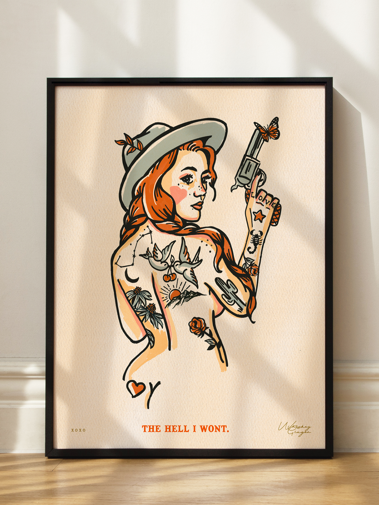 Eine kühne Illustration einer rothaarigen Frau mit einem Hut, die einen Revolver hält. Ihr Körper ist mit auffälligen Tätowierungen geschmückt, darunter Rosen, Vögel und Lilien, die eine Geschichte von Rebellion und Freiheit erzählen. Ein Schmetterling sitzt auf dem Revolver, was dem Bild eine unerwartete Sanftheit verleiht. Die Worte "Love" und "The hell I won't" unterstreichen die entschlossene und unkonventionelle Haltung der Figur. Dieses Kunstwerk ist perfekt für alle, die eine starke und unabhängige Botschaft in ihrem Raum vermitteln möchten.