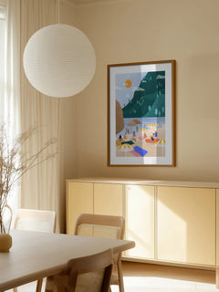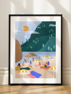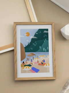 Die Illustration zeigt einen sonnenverwöhnten Strand mit gelb-weiß gestreiften Sonnenschirmen, umgeben von einer friedlichen Landschaft. Menschen entspannen sich auf bunten Handtüchern, während die Sonne am Himmel strahlt. Im Hintergrund sind sanfte Hügel und das ruhige Meer zu sehen, was eine entspannte und sommerliche Atmosphäre schafft. Dieser Druck ist perfekt, um das Gefühl eines perfekten Sommertages in Ihr Zuhause zu bringen.