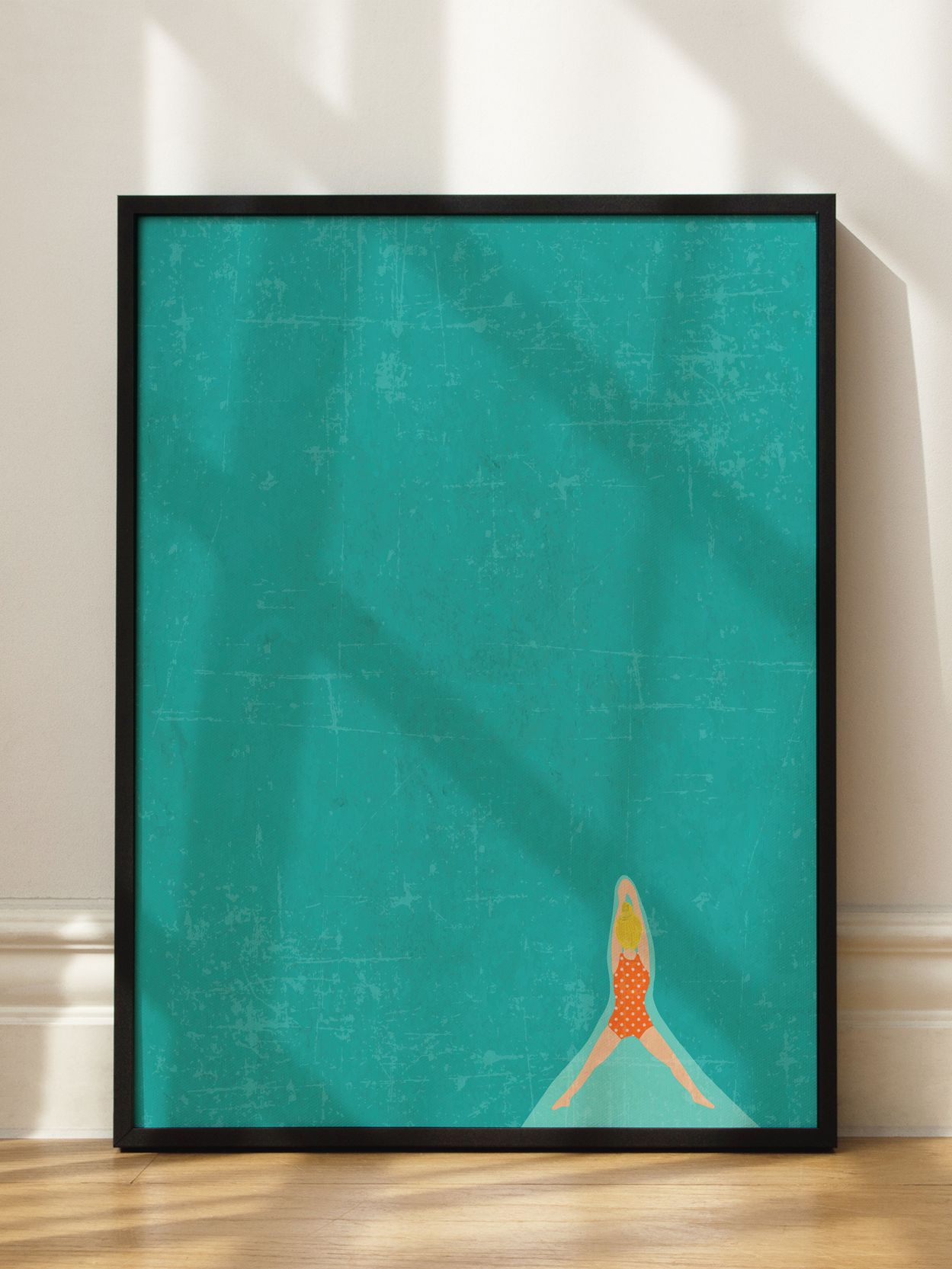 Diese grafische Illustration zeigt eine Frau in einem rotgepunkteten Badeanzug, die auf einem Sprungbrett steht, vor einem türkisfarbenen Hintergrund. Das Bild vermittelt den Nervenkitzel und die Vorfreude auf den Sprung ins Unbekannte. Die leuchtenden Farben und das minimalistische Design machen es zu einem auffälligen Kunstwerk, das Energie und Abenteuerlust ausstrahlt.