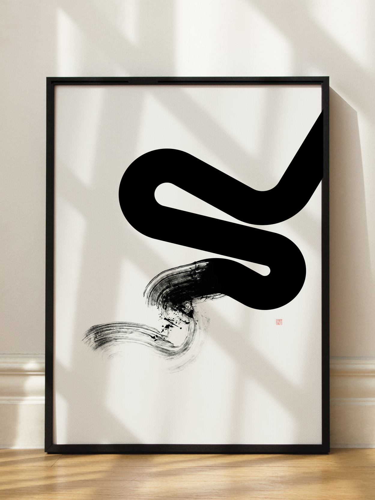 Ein minimalistisches Kunstwerk, das sich auf Kalligraphie und abstrakte Kunst konzentriert. Die Kombination aus handgemalten und digitalen Techniken bietet ein unverwechselbares visuelles Erlebnis. Perfekt für Liebhaber von moderner und abstrakter Kunst.