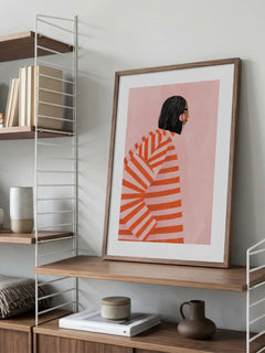 Diese Illustration von Bea Müller zeigt eine stilisierte Frau mit schwarzem Haar, die einen auffälligen rot-weiß gestreiften Pullover trägt. Der Hintergrund ist in einem sanften Rosa gehalten, was der Komposition eine moderne und zugleich verspielte Note verleiht. Die Kombination aus kräftigen Farben und minimalistischen Formen macht dieses Kunstwerk zu einem Blickfang in jedem Raum.