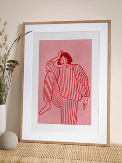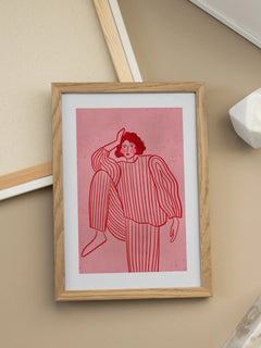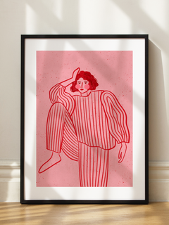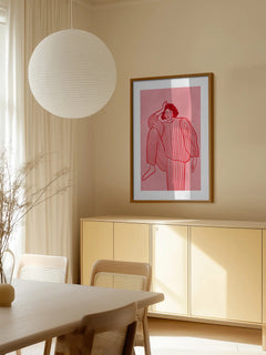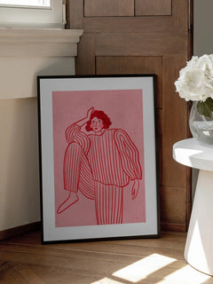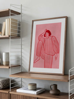 Diese Illustration zeigt eine Frau in einem gestreiften Anzug auf einem rosafarbenen Hintergrund. Die Frau hat schwarze Haare und rosa Bäckchen, was einen charmanten und modernen Look verleiht. Der gestreifte Anzug vermittelt einen entspannten Loungewear-Stil, der perfekt für Modebegeisterte ist. Der strukturierte pinke Hintergrund ergänzt das minimalistische Design und macht diesen Druck zu einem idealen Kunstwerk für Liebhaber moderner Illustrationen.