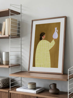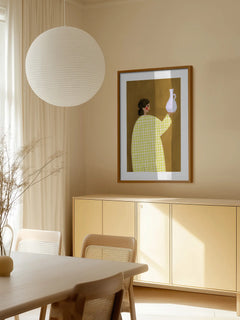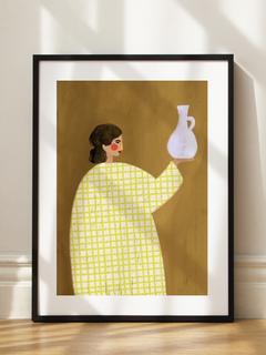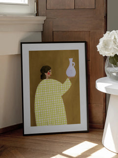 Dieses Poster von Bea Müller zeigt eine stilvolle Illustration einer Frau in einem gelben karierten Kleid, die eine weiße Vase in der Hand hält. Der Hintergrund ist in einem warmen Braunton gehalten, der die Szene elegant und zeitlos erscheinen lässt. Die Kombination aus den klaren Linien des Kleides und der schlichten Form der Vase verleiht dem Bild eine moderne und zugleich klassische Ästhetik. Perfekt für Kunstliebhaber, die ihrem Raum einen Hauch von Eleganz und Raffinesse verleihen möchten.