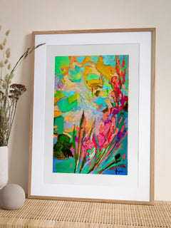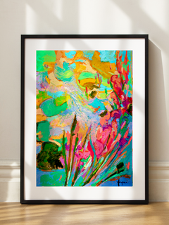 Dieses abstrakte Poster ist eine Explosion von Farben und Formen. Es hat leuchtende Farbtupfer in Gelb, Türkis, Rosa, Rot und Grün, die einen dynamischen, vielschichtigen Effekt erzeugen. Die Farben sind dick aufgetragen und verleihen dem Poster sichtbare Textur. Schwarze Linien setzen Akzente und heben bestimmte Formen hervor. Die Formen und Farben wirken zufällig, es gibt keine erkennbaren Objekte oder Figuren. Das Gesamtgefühl ist energisch, chaotisch und lebendig.