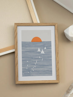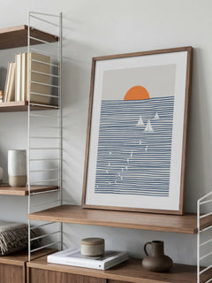 Ein minimalistisches Segelboot-Motiv mit drei weißen Segeln vor gestreiftem Meereshintergrund und oranger Sonne. Funktioniert besonders gut in maritimen Räumen und ergänzt Blau-Weiß-Einrichtung. Ein ruhiger Akzent für Entspannung und Fernweh.
