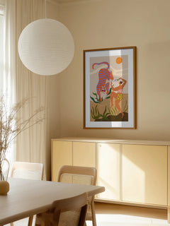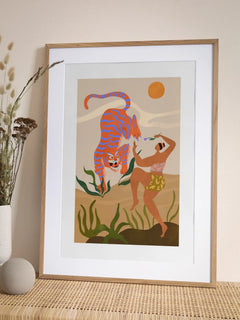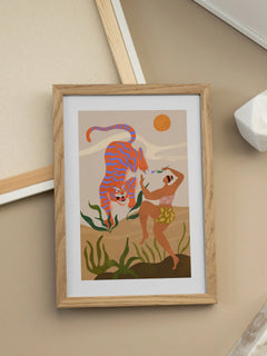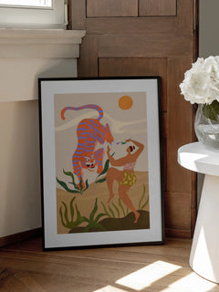 Ein tanzendes Paar mit majestätischem Tiger in warmen Orange- und Beigetönen. Die mystische Szene funktioniert besonders gut in boho-inspirierten Räumen. Weckt Fernweh und verleiht jedem Raum eine exotische Note.