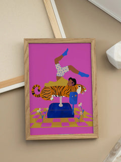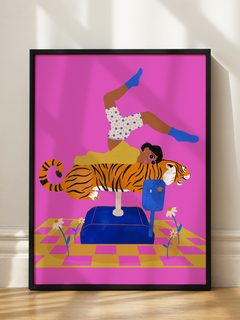 Dieses lebendige Kunstwerk zeigt eine Frau, die rückwärts auf einem Klettergerüst liegt und sich an einem Tiger festhält. Neben ihr steht ein blauer Briefkasten, und der Hintergrund ist in einem kräftigen Pink gehalten. Die Szene ist originell und fantasievoll, mit einem spielerischen und surrealen Touch, der die Grenzen der Realität überschreitet. Die kräftigen Farben und das einzigartige Motiv machen dieses Bild zu einem echten Hingucker und einem Ausdruck von Kreativität und Individualität.