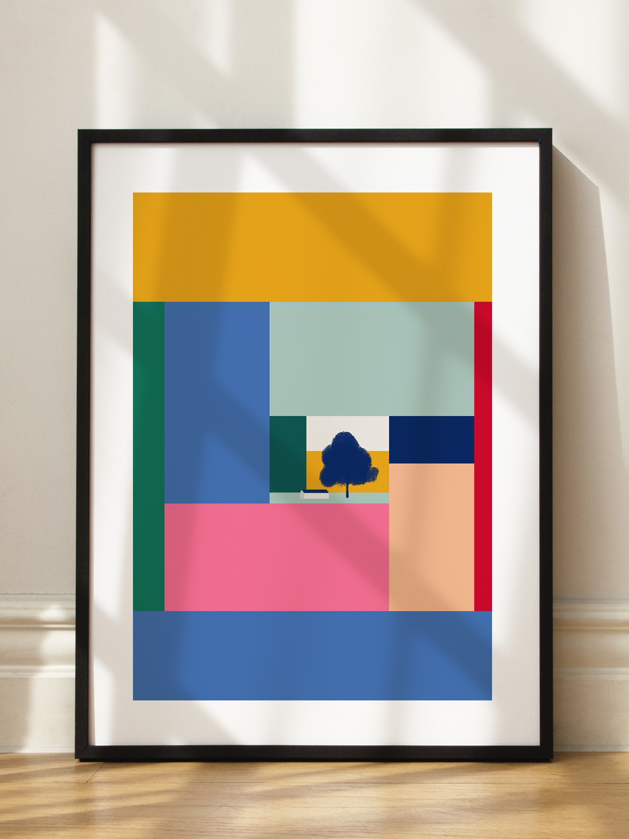 Dieses Poster zeigt ein abstraktes Design mit einem Baum und einem Haus, die von farbenfrohen Blöcken umgeben sind. Die lebendige Farbpalette und die geometrischen Formen verleihen jedem Raum eine moderne und künstlerische Note. Perfekt für Liebhaber von abstrakter Kunst und farbenfrohen Dekorationen.