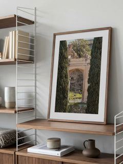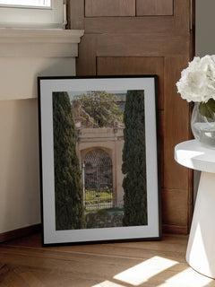 Ein toskanisches Tor mit historischem Charme zwischen Zypressen führt den Blick in einen mediterranen Innenhof. Die warmen Erdtöne und die klassische Architektur schaffen eine einladende Atmosphäre. Passt perfekt zu rustikaler und mediterraner Einrichtung.