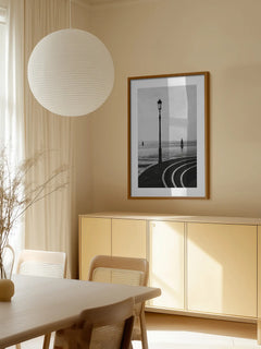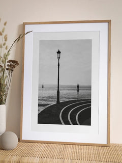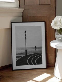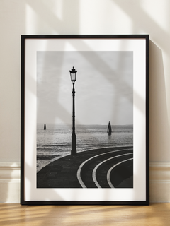 Venezianische Promenade mit klassischer Laterne und Stufen zum Meer. Zeitlose Schwarz-Weiß-Fotografie, die mediterranen Charme ins Zuhause holt. Setzt elegante Akzente in modernen Wohnräumen.