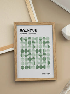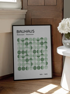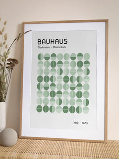 Dieses Poster zeigt eine grafische Illustration mit Kreisen in verschiedenen Grüntönen auf einem weißen Hintergrund. Oben und unten befindet sich schwarzer Text, der "Bauhaus, Modernism - Minimalism, 1919 - 1923" lautet. Das Design verkörpert einen modernen Look und ist ideal für ein minimalistisches Zuhause geeignet.