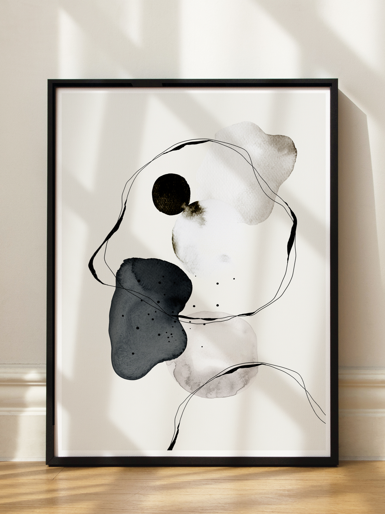 Diese Aquarell-Illustration zeigt eine harmonische Komposition aus Farbklecksen und Linien in Schwarz und Beige auf einem hellgrauen Hintergrund. Die schlichte Farbpalette ermöglicht eine mühelose Integration in verschiedene Einrichtungsstile und verleiht jedem Raum eine elegante und moderne Note.